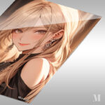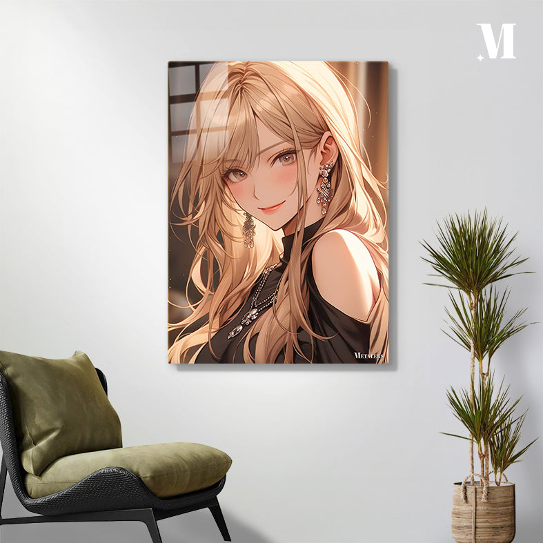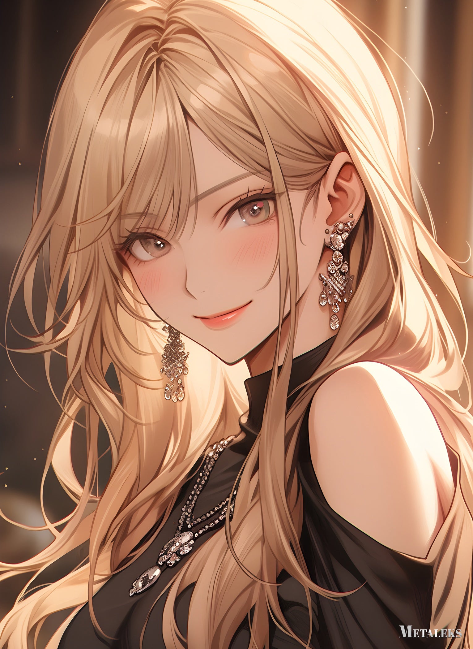 A woman with long blonde hair wearing a black outfit and large, ornate earrings. Metaleks Ultra HD Metal Poster – Create Your Passionate Space.