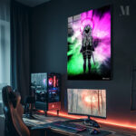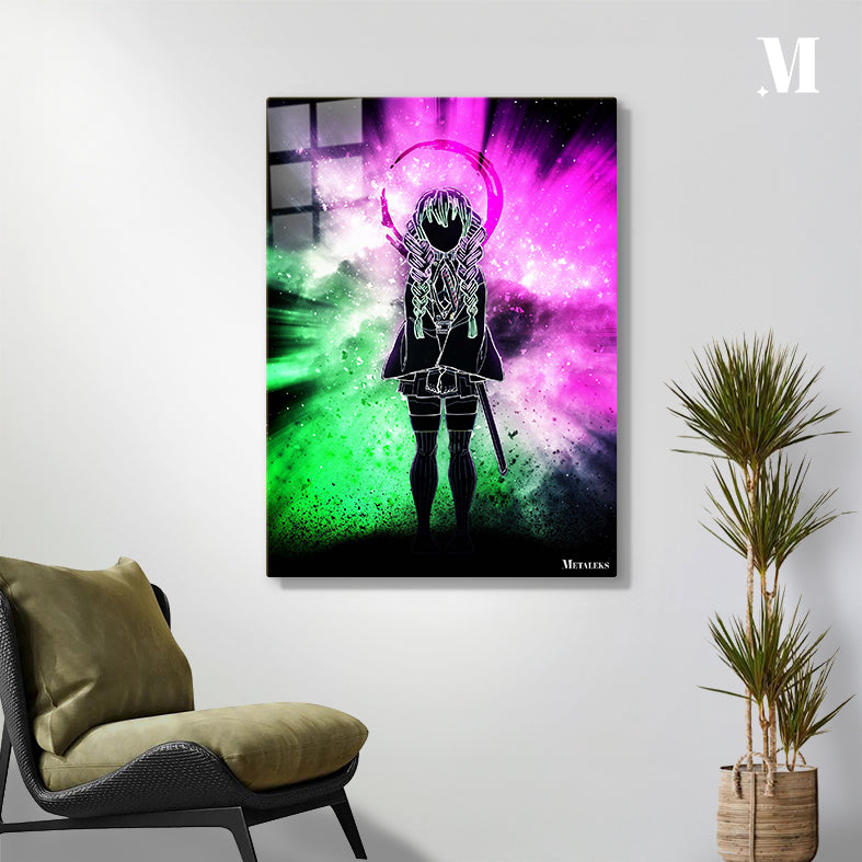 A character with long braided hair, wearing a dark outfit with a sword at their side, stands with a halo-like symbol above their head against a vibrant, cosmic background. Metaleks Ultra HD Metal Poster – Create Your Passionate Space.