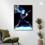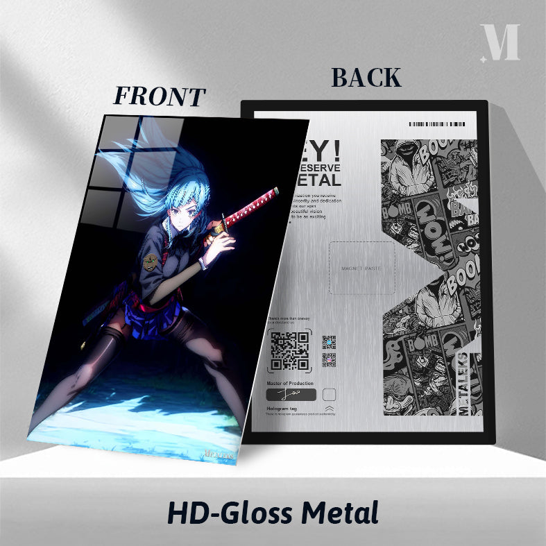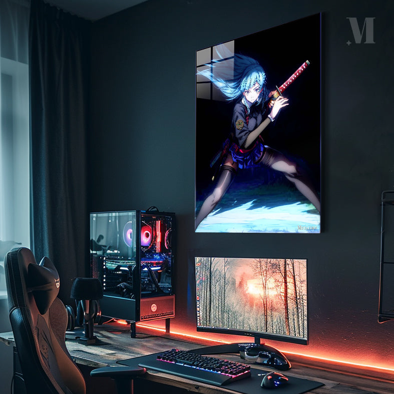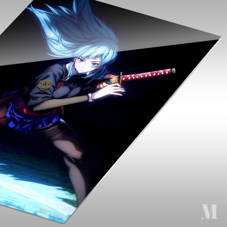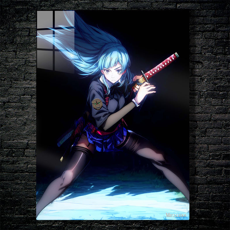 A girl with blue hair is holding a red and gold katana. She is wearing a dark top with a badge, a blue skirt, and black thigh-high stockings. Her hair is flowing, and she appears to be in a combat stance. Metaleks Ultra HD Metal Poster – Create Your Passionate Space.
