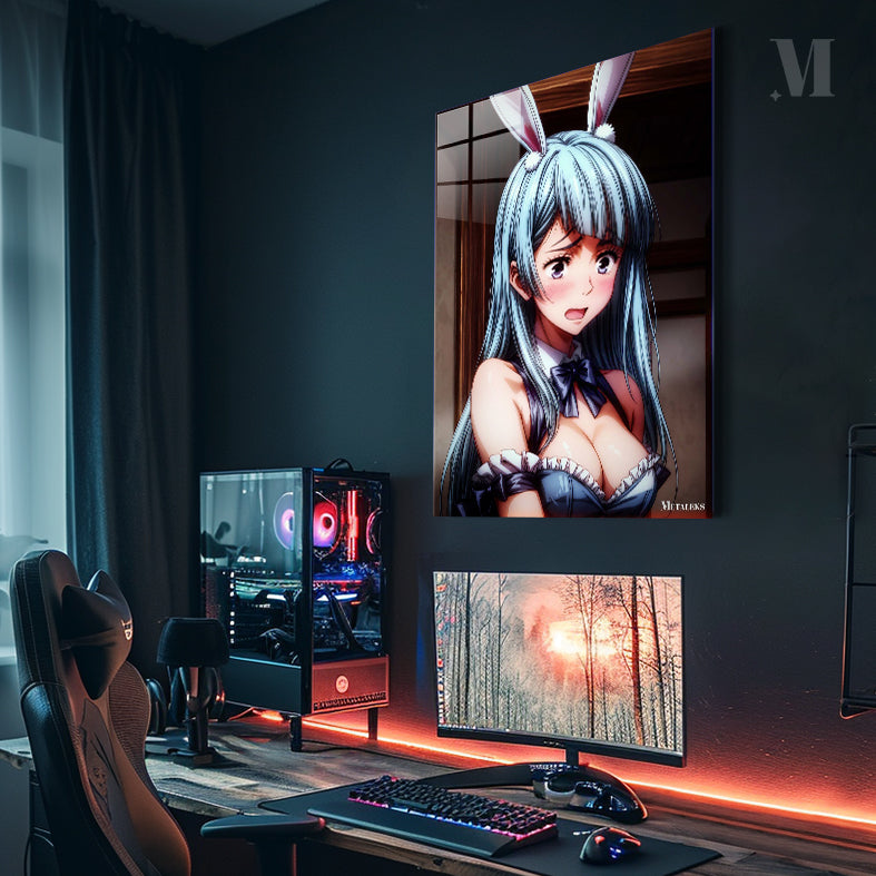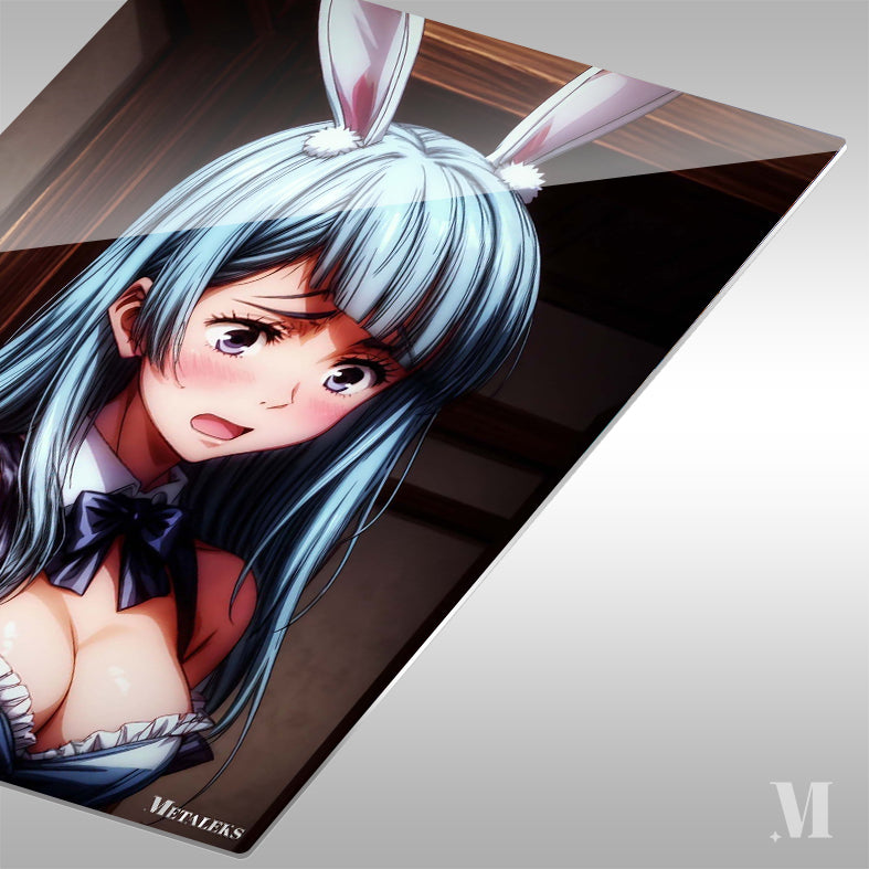 A character with long blue hair, wearing a blue outfit with a black bow and bunny ears. Metaleks Ultra HD Metal Poster – Create Your Passionate Space.