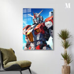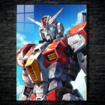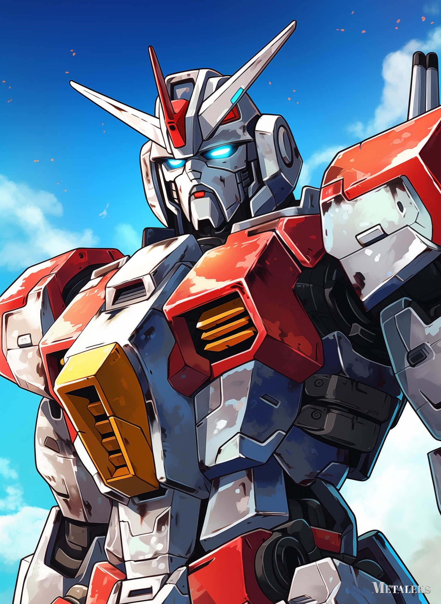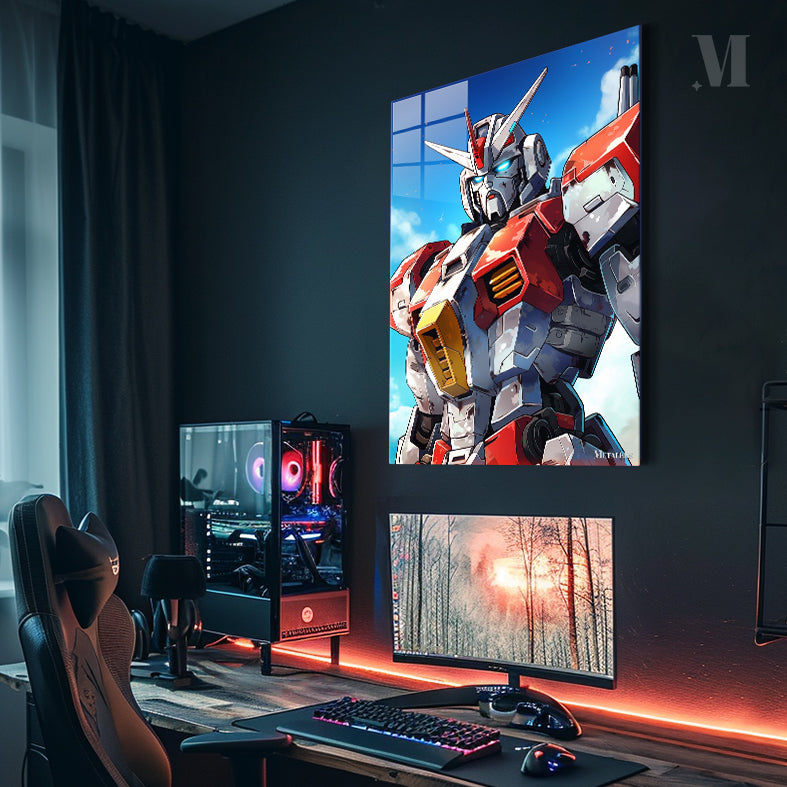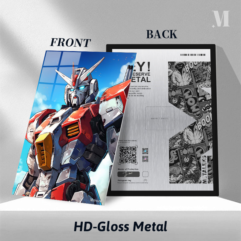 A Gundam robot from the “Mobile Suit Gundam” series stands against a clear blue sky. The robot has a silver and red color scheme with a distinctive horned helmet. Its eyes glow blue, and it features detailed armor plating with yellow accents on the chest. Metaleks Ultra HD Metal Poster – Create Your Passionate Space.