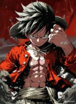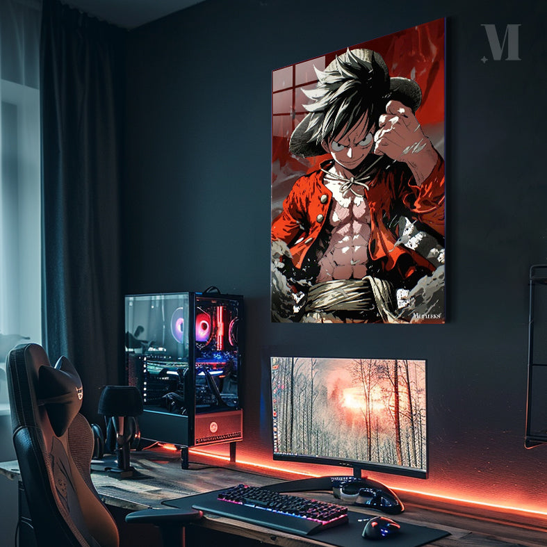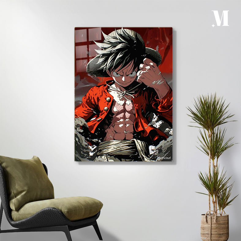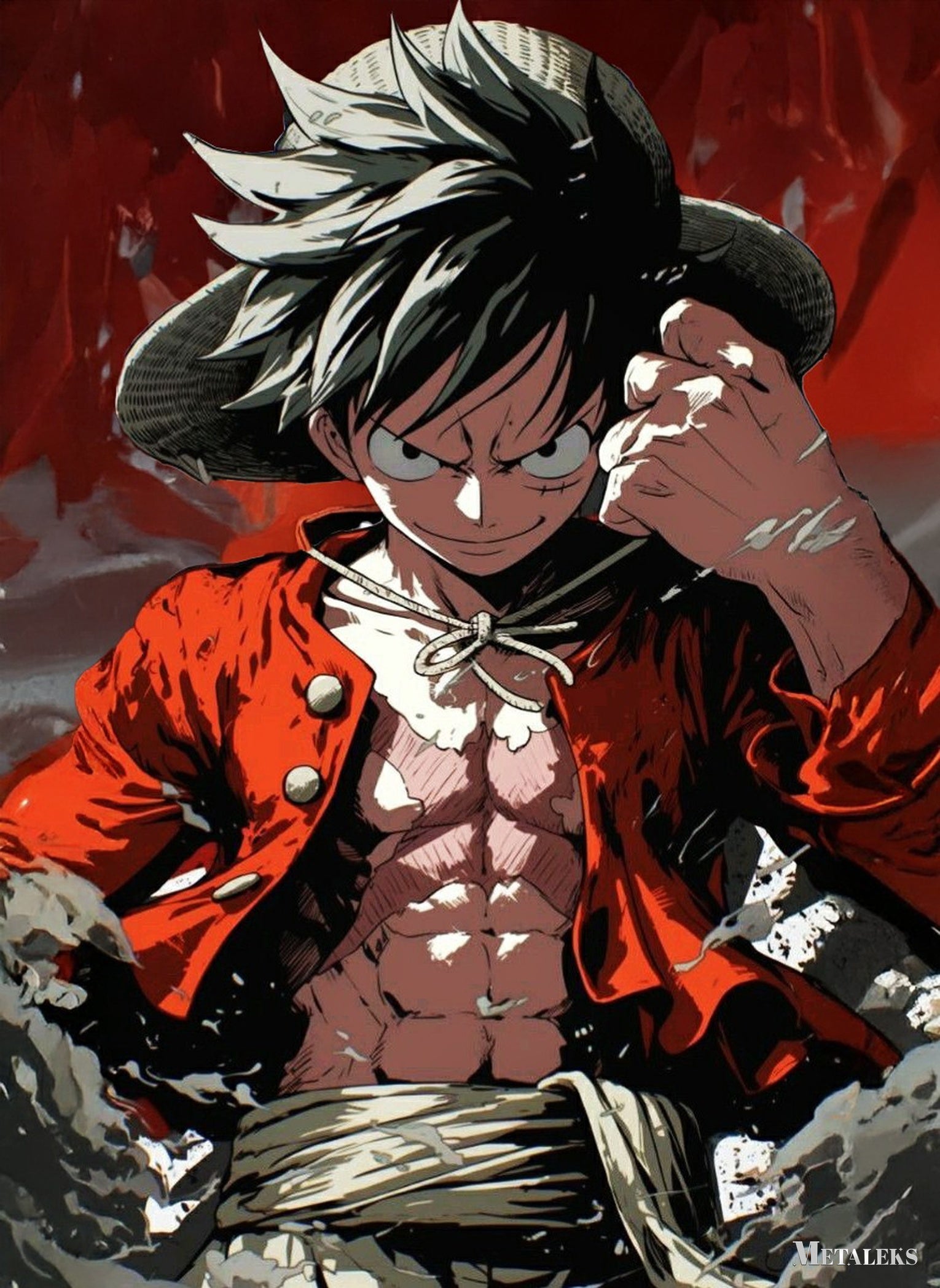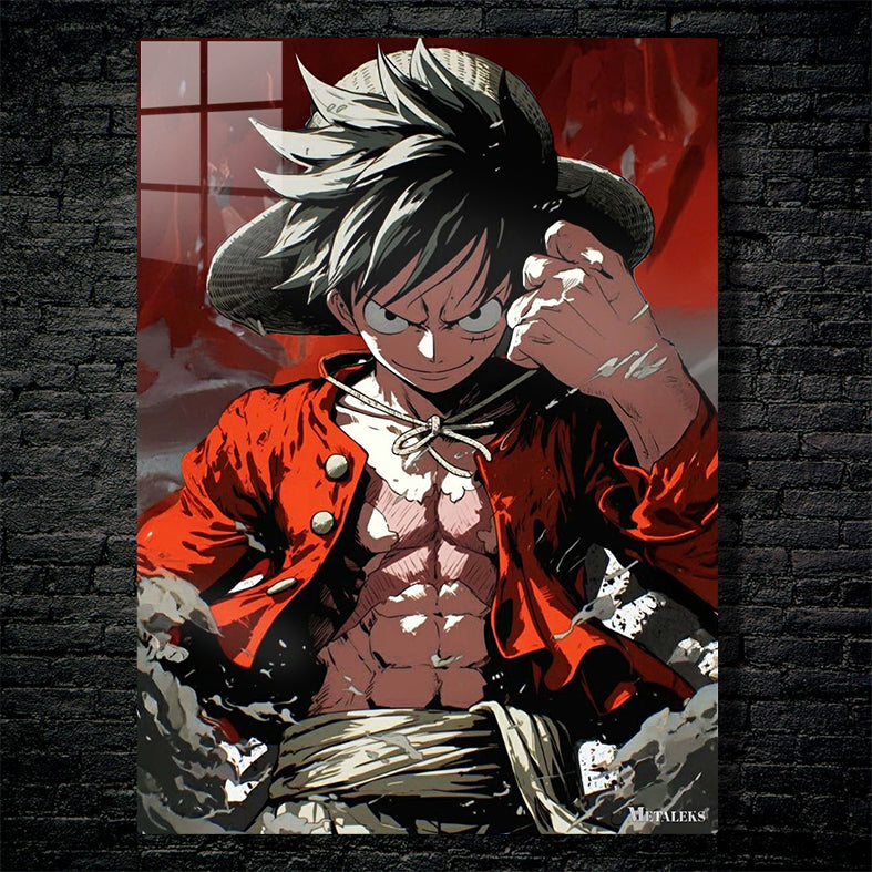 Monkey D. Luffy from One Piece is shown wearing his signature straw hat and a red open jacket, revealing his muscular torso. He has a determined expression, and his fist is clenched.