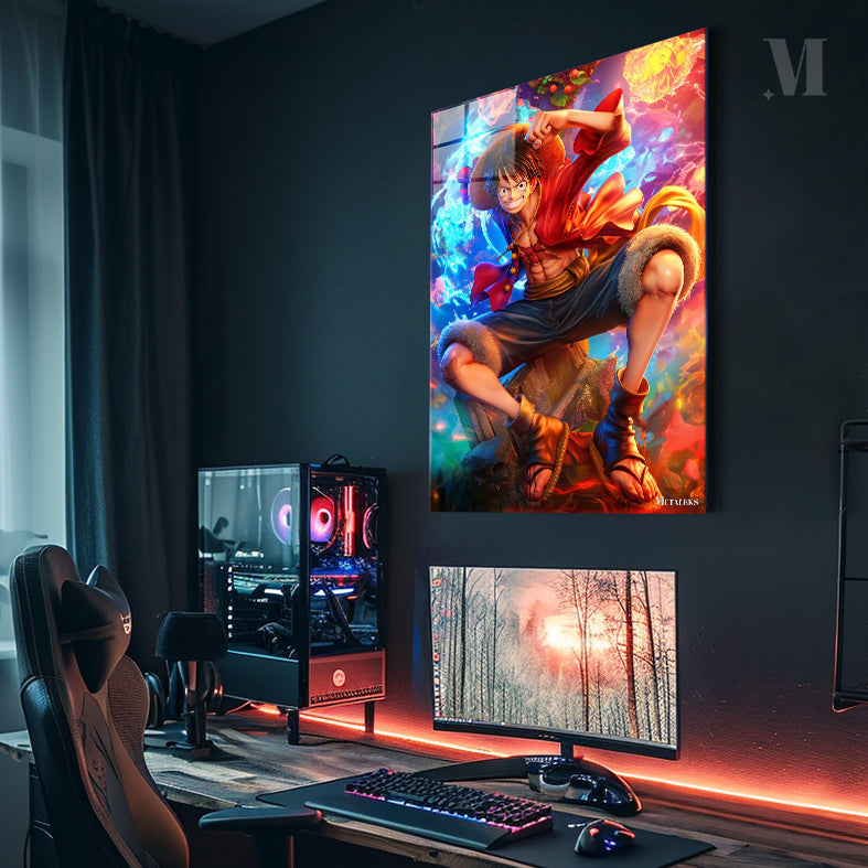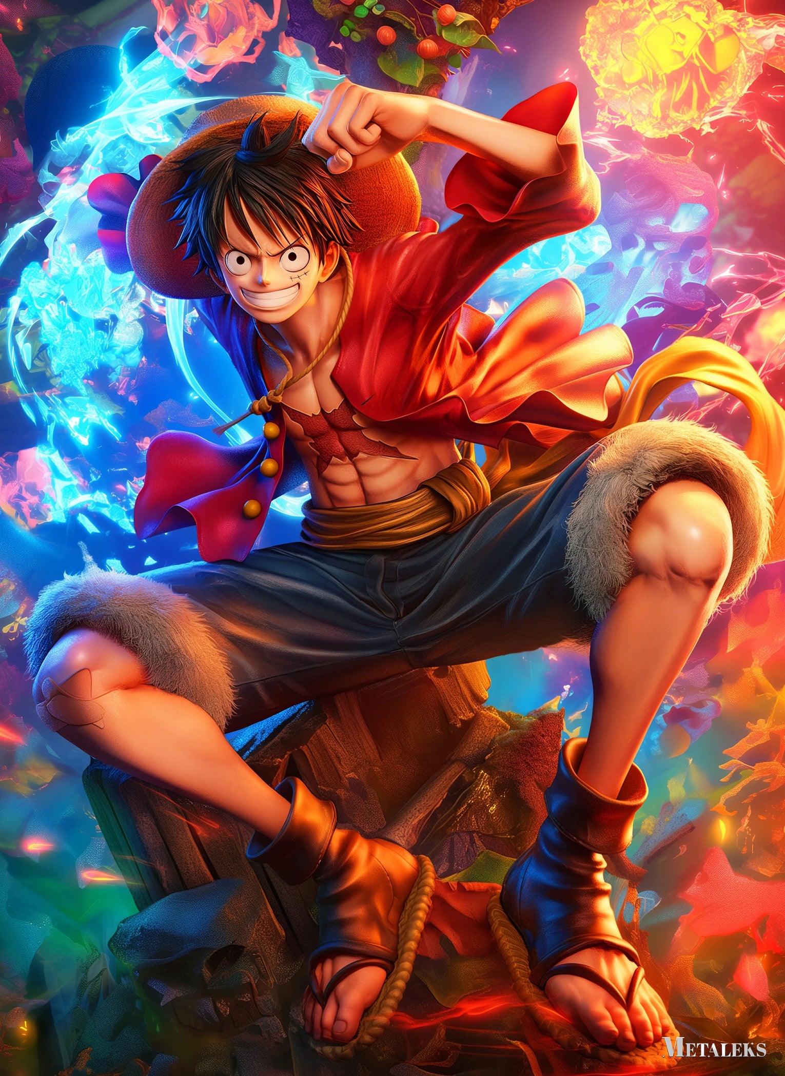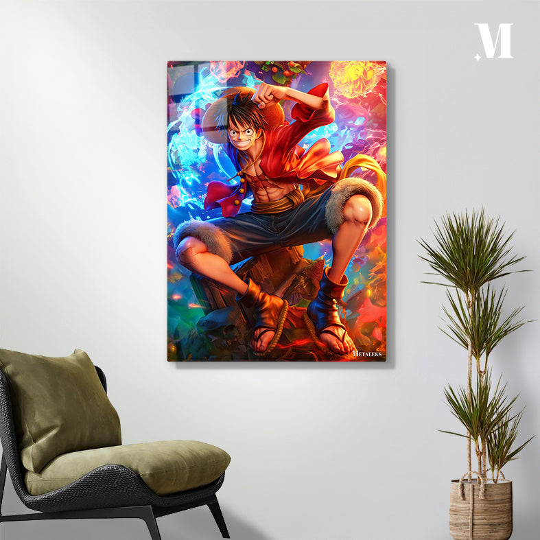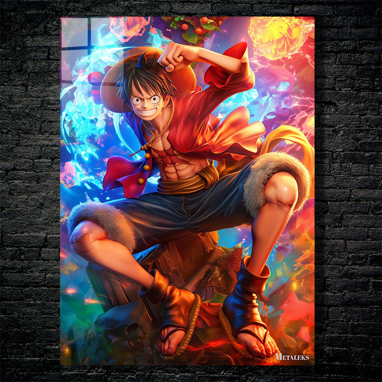 Monkey D. Luffy from One Piece is in a dynamic pose, crouched on a rocky surface with one fist raised. He wears his signature straw hat, a red open shirt, and dark pants with fur trim at the knees. His expression is determined and confident.